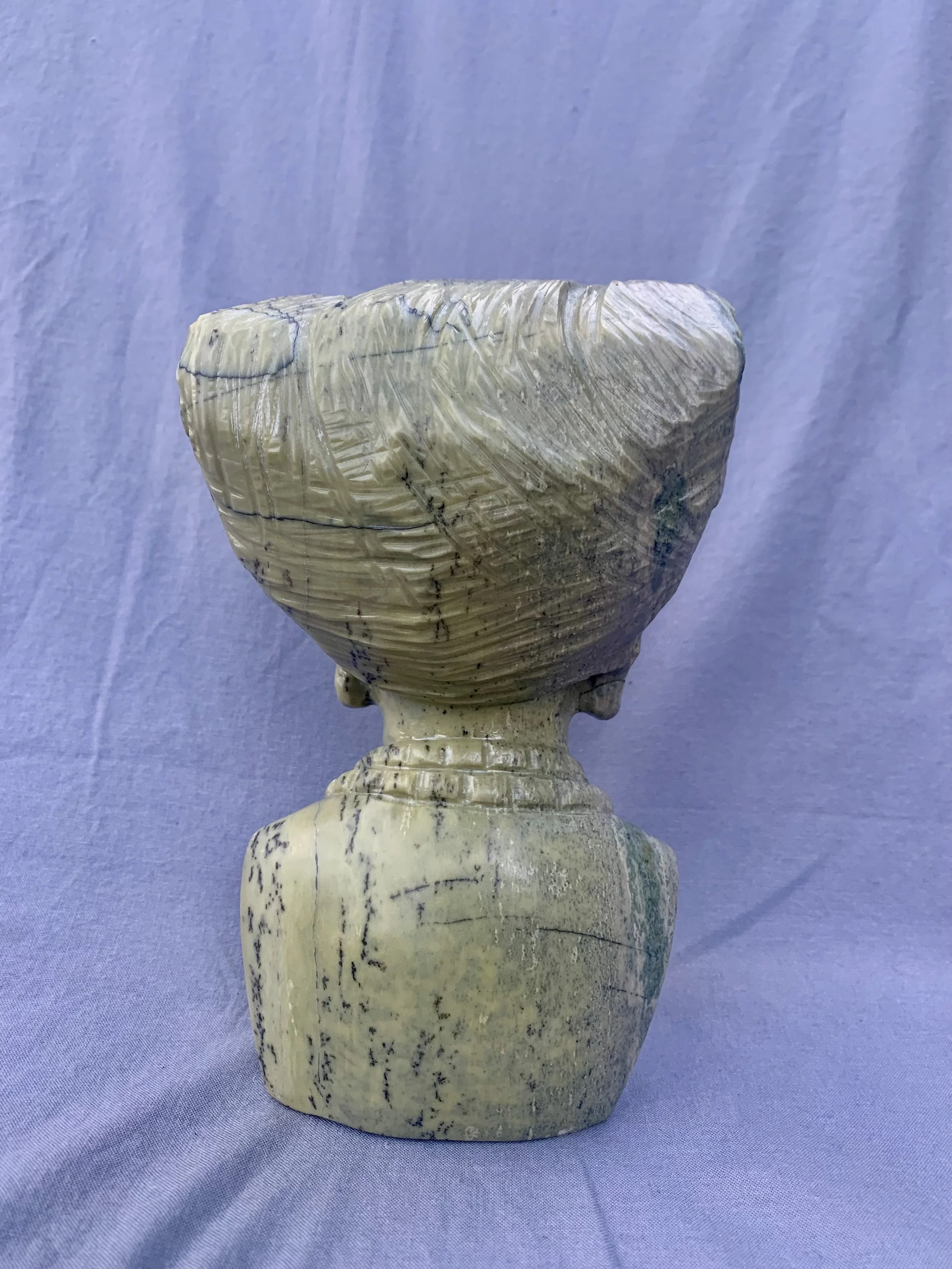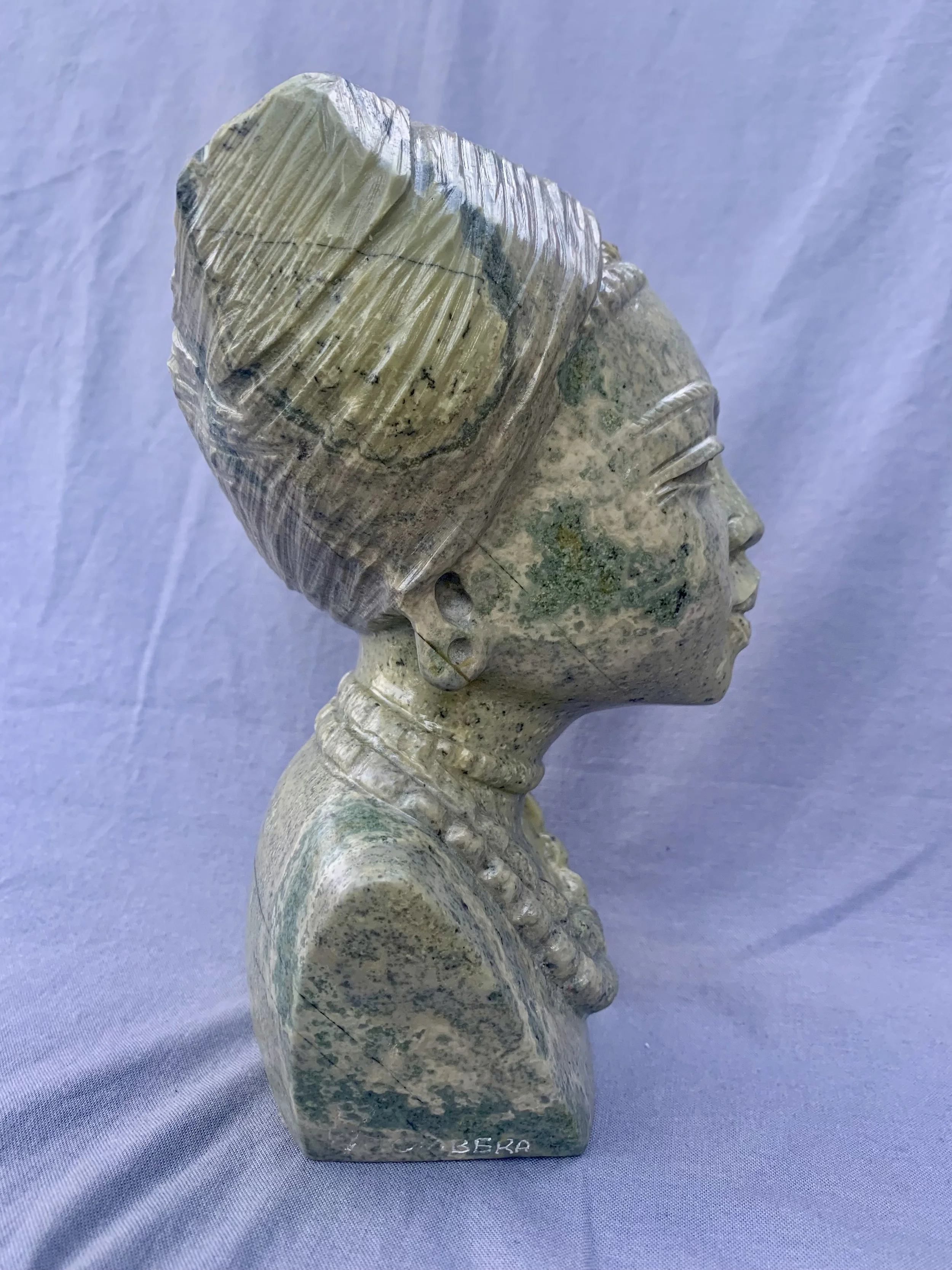 Small woman sculpture hand made in Zimbabwe out of a semiprecious stone called butterjade. It is 5.5” tall, 3” wide , 2.5” deep and weighs about 1.5 pounds.